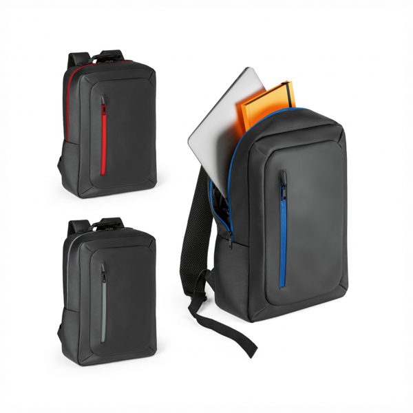 Mochila para notebook em poliéster 600D impermeável. Compartimento principal almofadado para notebook até 15.6”. Bolso frontal com zípers impermeáveis. Bolso lateral em tela. Parte posterior almofadada, com sistema de apoio acolchoado para as costas e alças almofadadas.