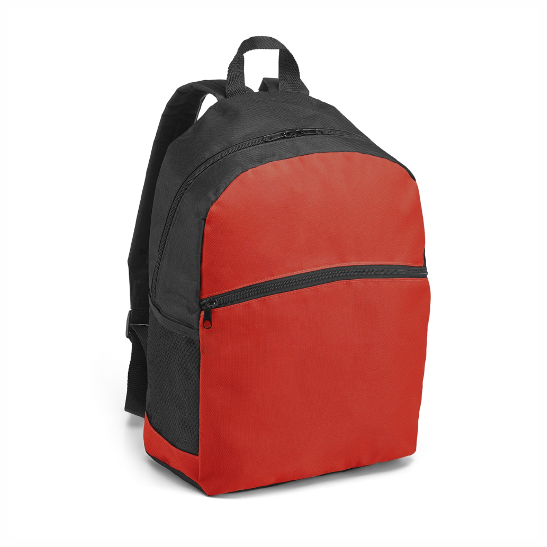 Mochila com bolso exterior e bolsos laterais em rede. Parte posterior almofadada.