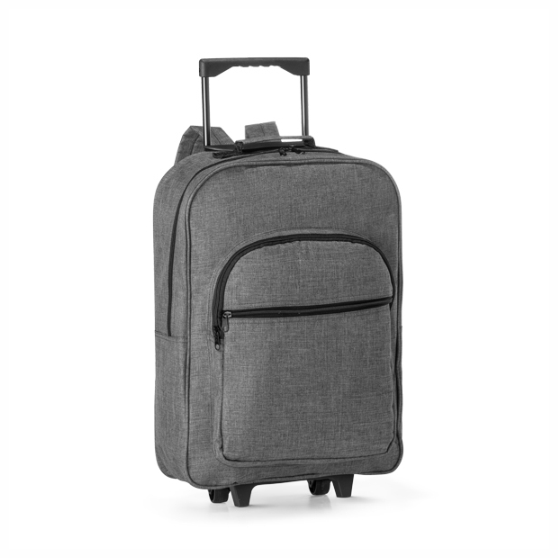 Mochila trolley 600D de alta densidade. Com 2 rodas. Compartimento almofadado para notebook até 17”. Interior forrado. Bolso frontal com zíper. Pega extensível (altura da pega estendida: 355 mm). Capacidade: 21 L.