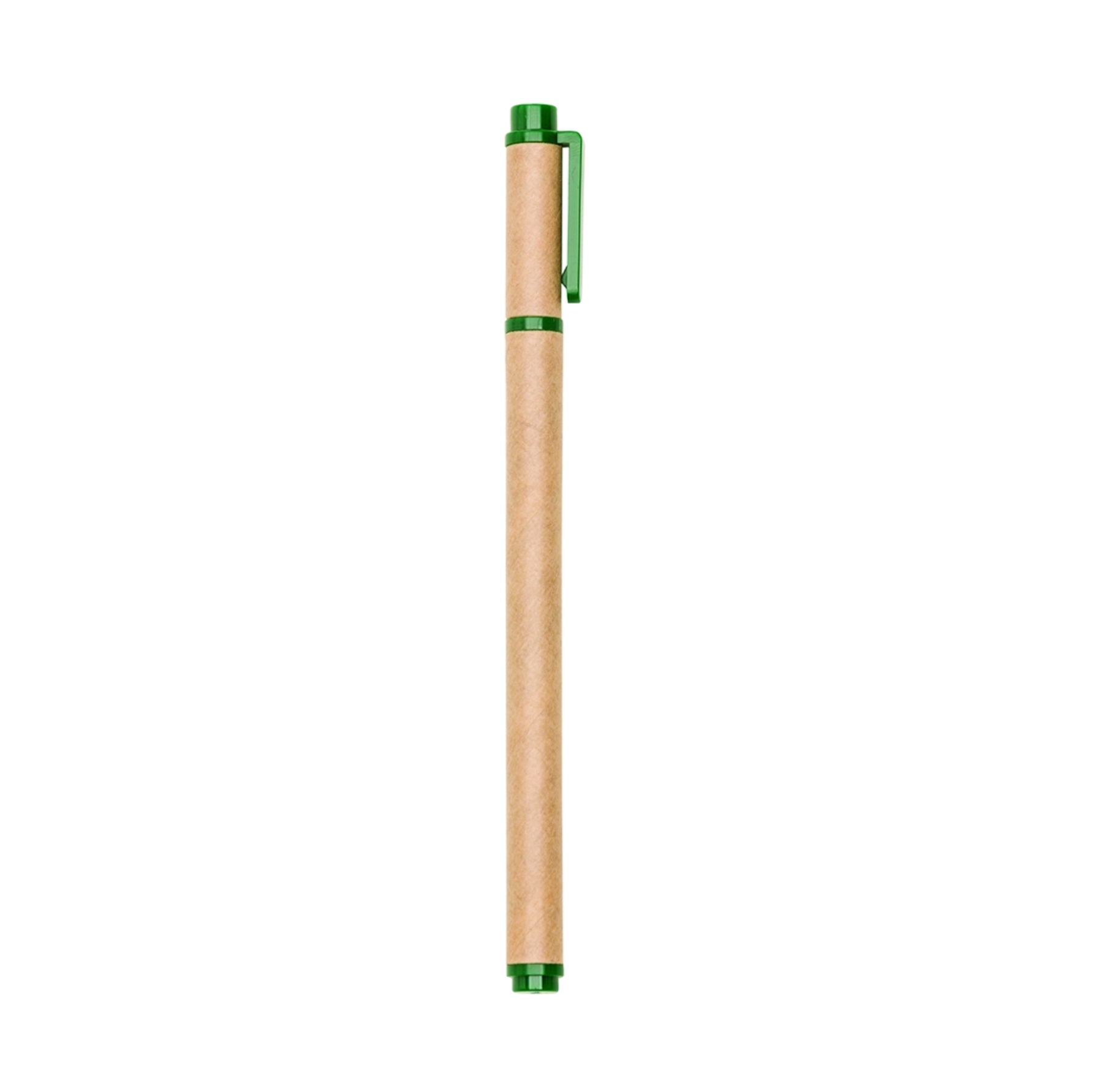 Caneta ecológica roller. Caneta de material kraft com tampa, possui clip plástico colorido, anel e parte inferior plástica colorida.