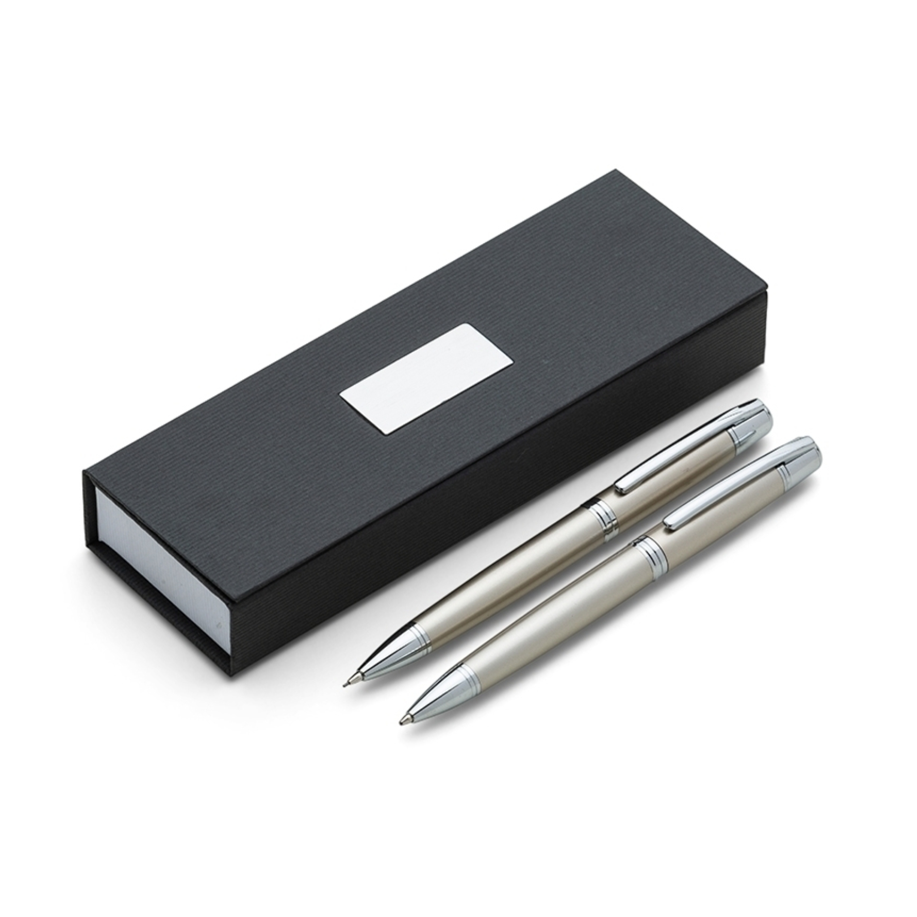 Conjunto caneta e lapiseira em estojo de cartonagem com placa central para personalização. Clip metal com dois anéis em relevo, anel centralizado e dois anéis em relevo na ponteira e acionam por giro. Estojo revestida com espuma na parte interna.