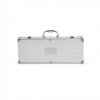Kit churrasco em aço inox. Luva de cozinha em poliéster e 6 peças em estojo de alumínio.