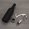 Kit vinho formato garrafa com 3 peças: wine collar, bico condutor com tampa e saca rolhas metálico com lâmina de corte e abridor de garrafa. Estojo com fechamento imantado e área interna com berço de espuma.
