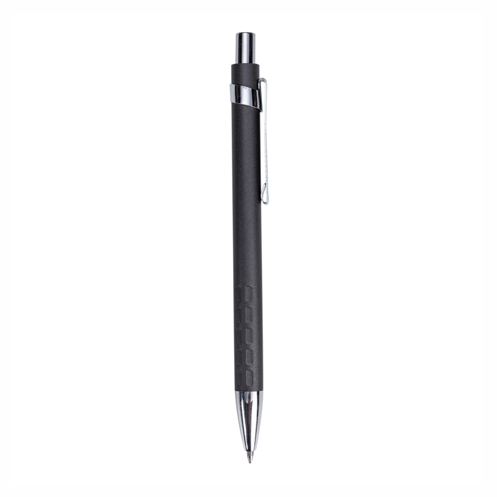 Caneta metálica com carga esferográfica azul e acionamento por clique.