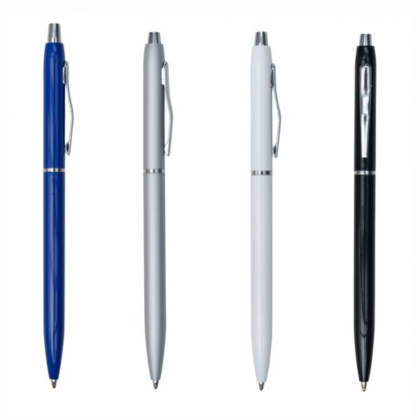 Caneta metálica com carga esferográfica azul e acionamento por clique.