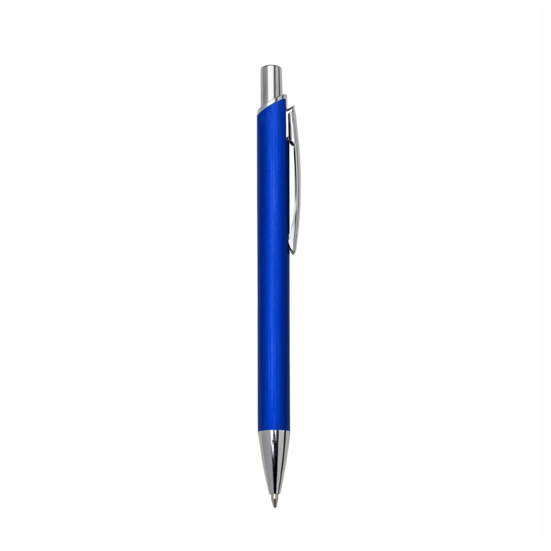 Caneta alumínio, carga esferográfica azul e acionamento por clique.