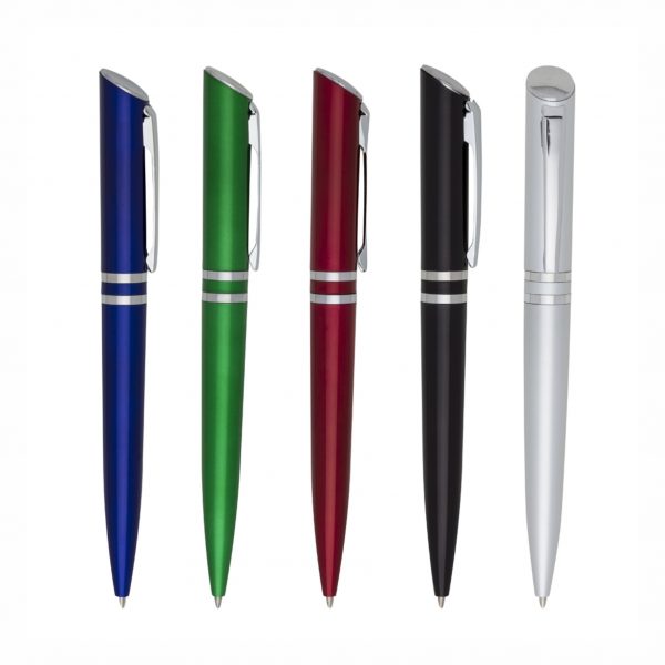 Caneta plástica inteira colorida com detalhes em prata. Clip de metal, possui dois aneis prata no centro. Aciona por giro.