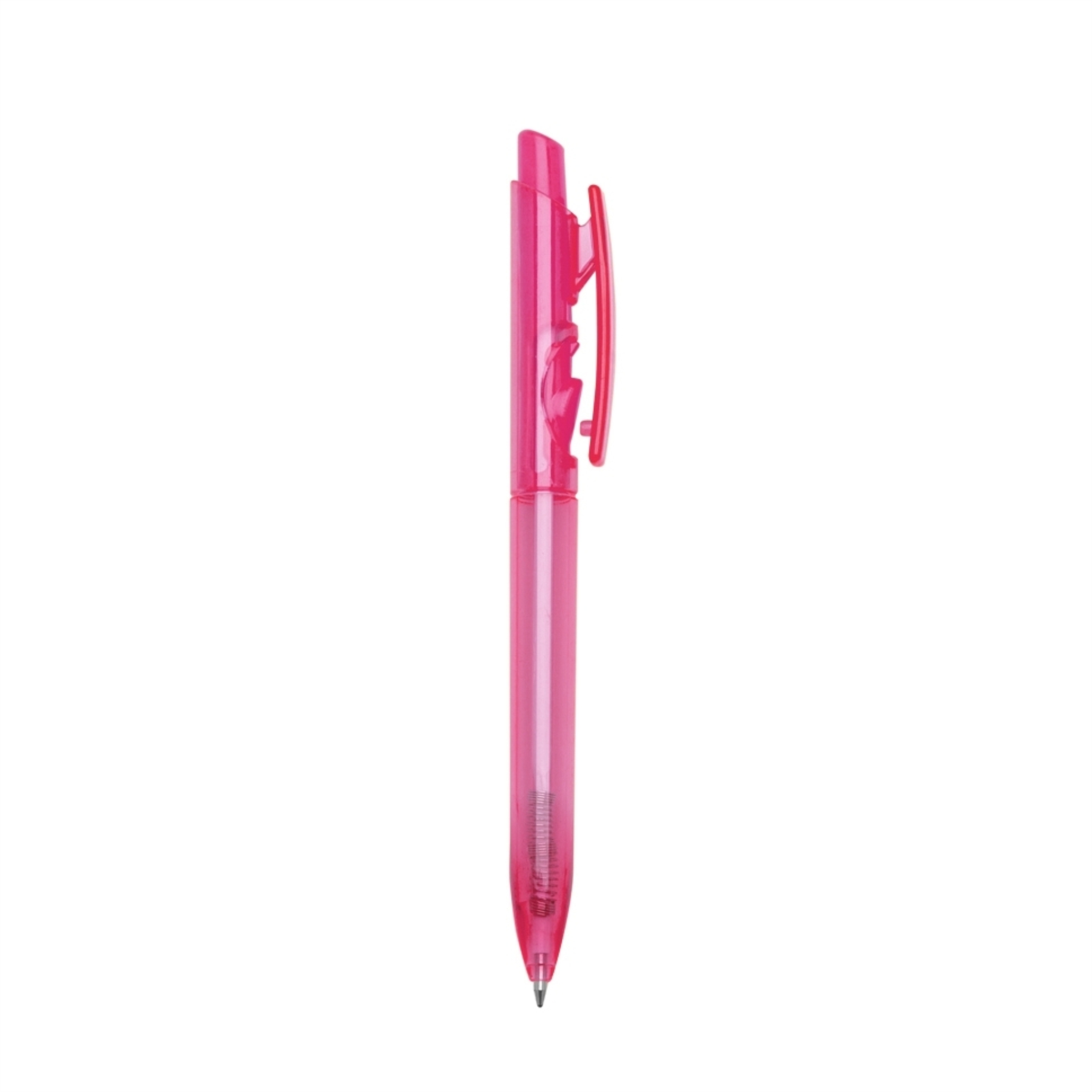 Caneta plástica fluorescente inteira colorida. Aciona por clique e para destravar basta apertar a parte inferior do clip.