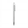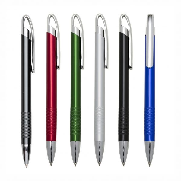 Caneta semimetálica, carga esferográfica azul e acionamento por clique.