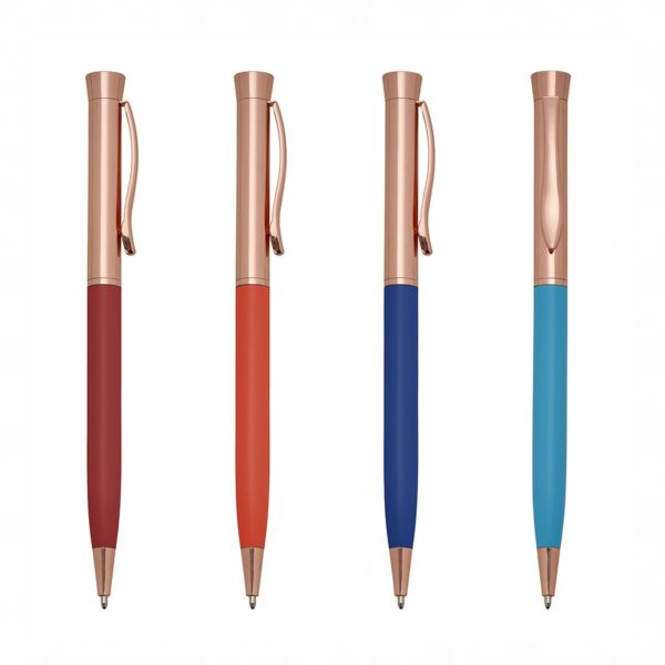 Caneta semimetálica com carga esferográfica azul e acionamento por rotação.
